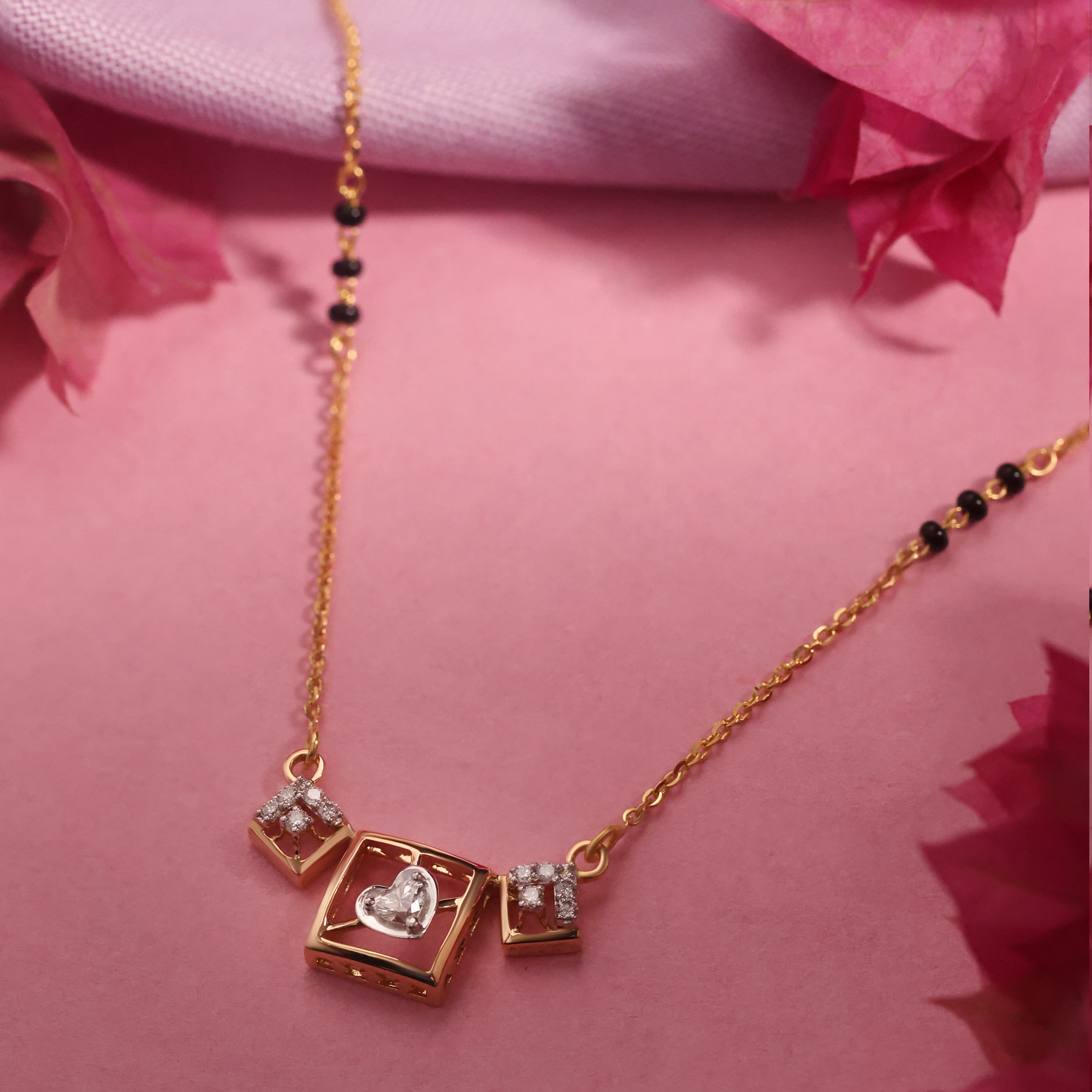 Check this Chic Adore Diamond Mangalsutra. Adorned with 0.21 carats of dazzling diamonds and featuring a stylish heart motif, this sleek pendant in 18K gold celebrates the eternal love shared between partners, elegantly blending timeless tradition with contemporary charm.