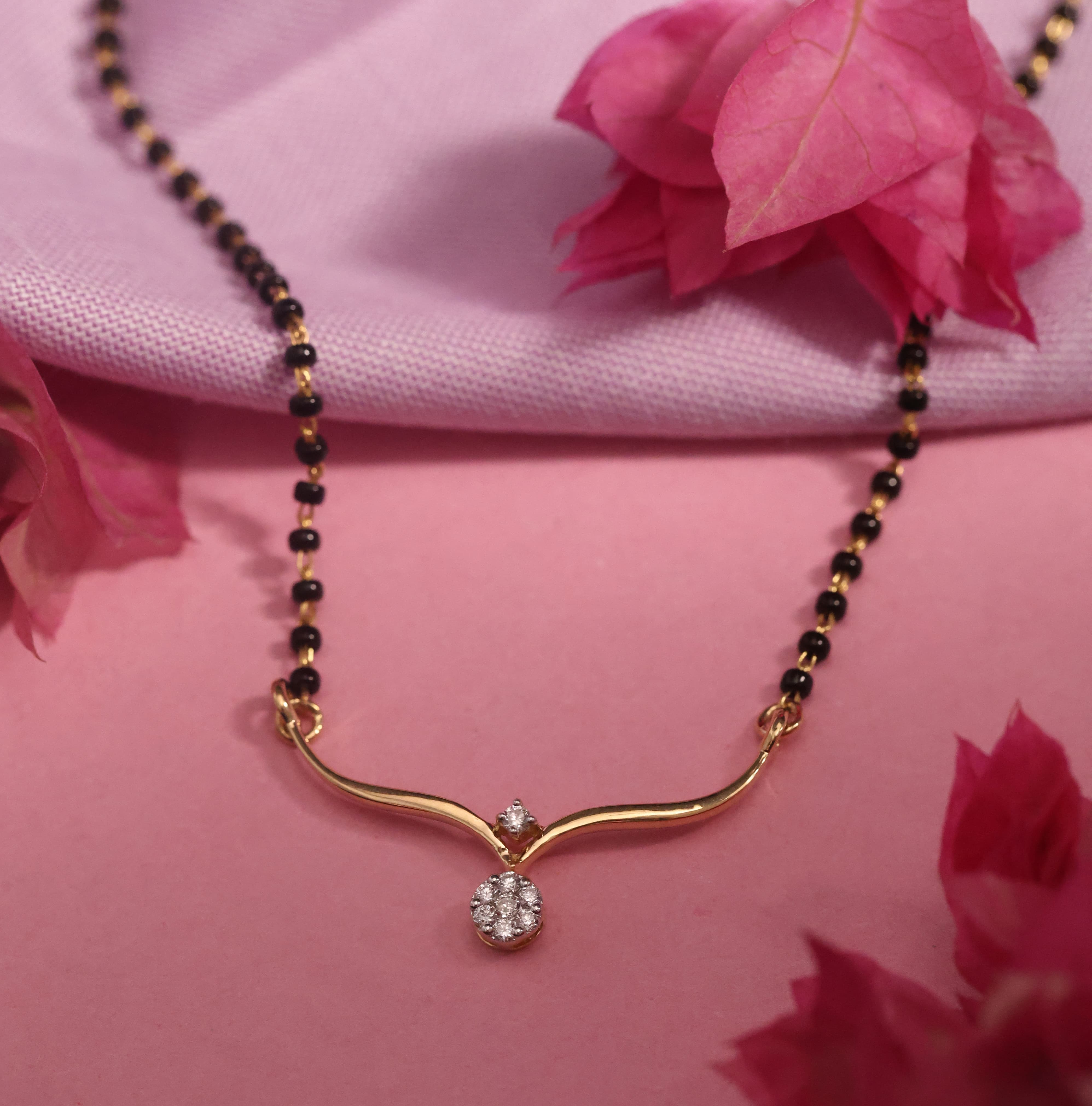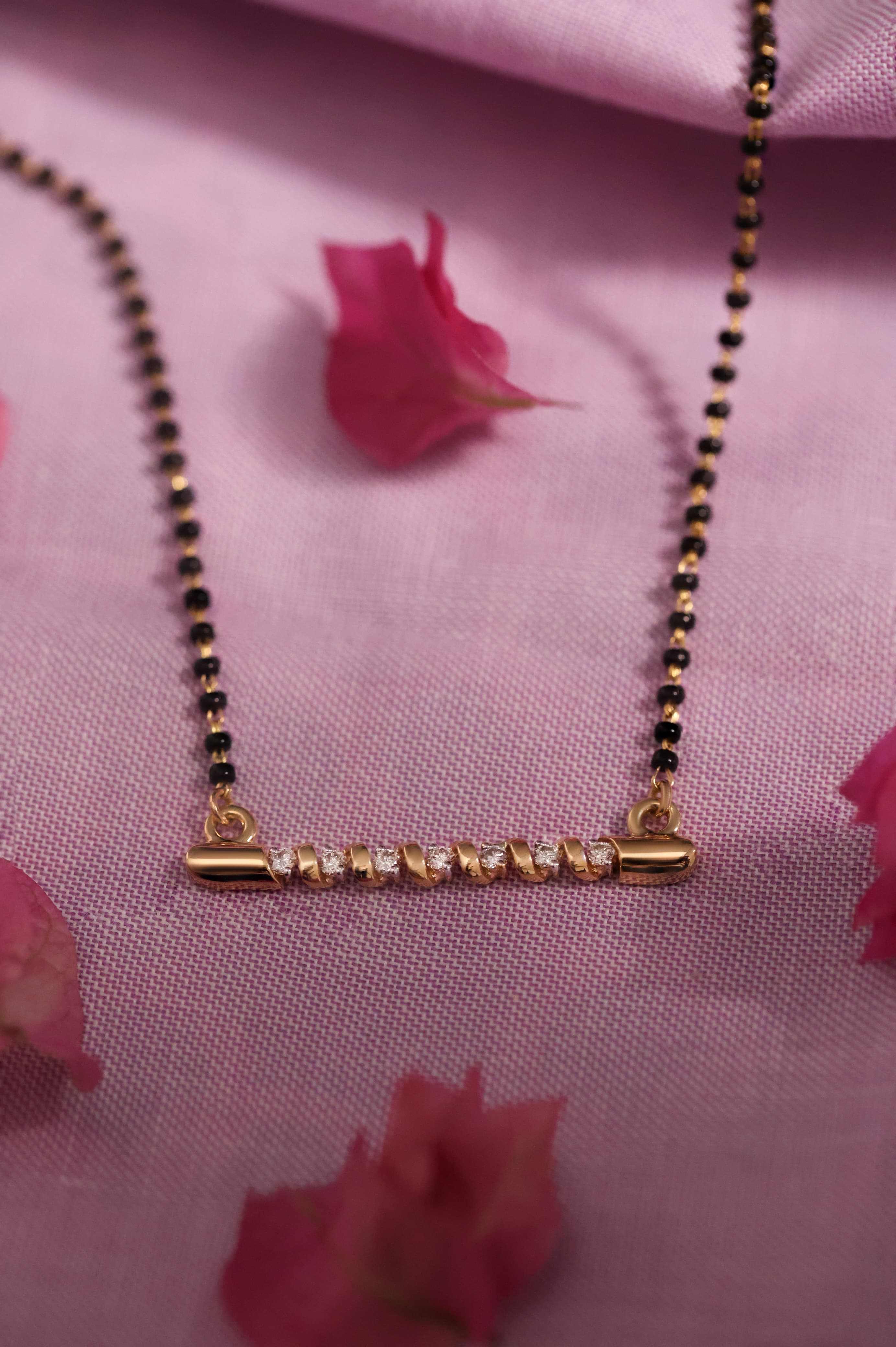 A beautiful fusion of tradition and contemporary elegance, exemplified perfectly by the stunning Twisted Shimmer Diamond Mangalsutra. Presenting a 0.24 carat diamond mangalsutra, intricately crafted in 18K gold, featuring a captivating twisted pattern symbolizing the beautiful journey of marriage.