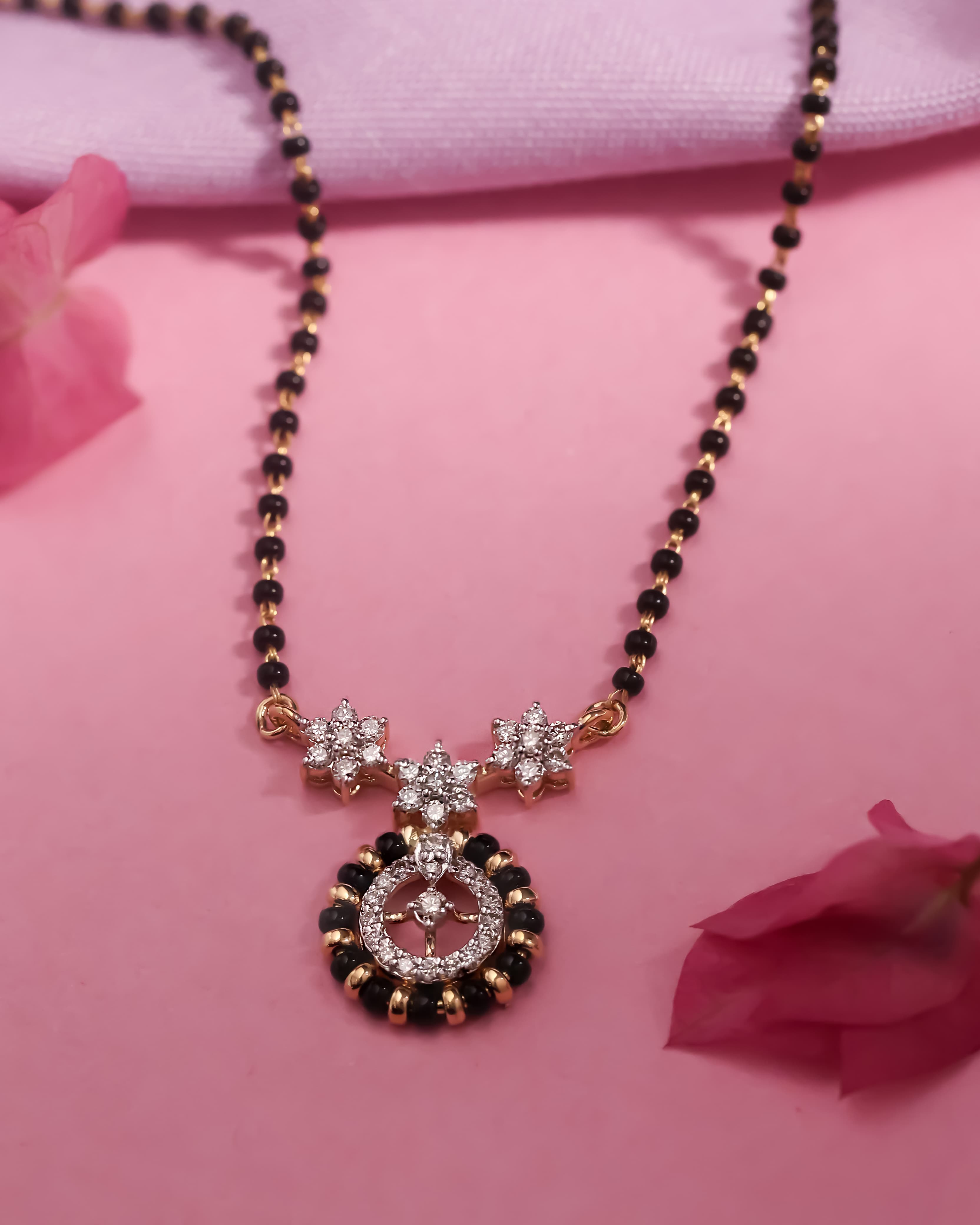 Offering brides a blend of heritage and contemporary sophistication by presenting the Floral Wreath Diamond Mangalsutra. Embrace nature's grace with this 0.67 carat diamond mangalsutra in 18K gold, resembling a delicate floral wreath. Perfect for complementing your traditional attire with timeless allure.