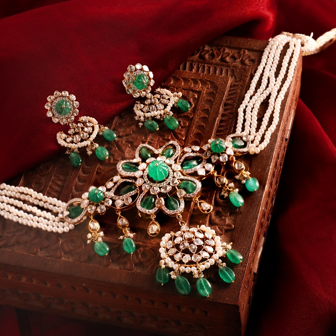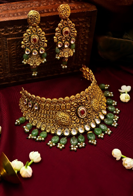 Blossomed Greenery Polki Choker Necklace & Captivating Planter Polki Drop Earrings