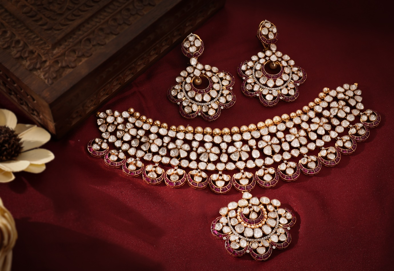 Rosy Grandeur Polki Necklace & Crimson Blush Polki Chandbali Earrings