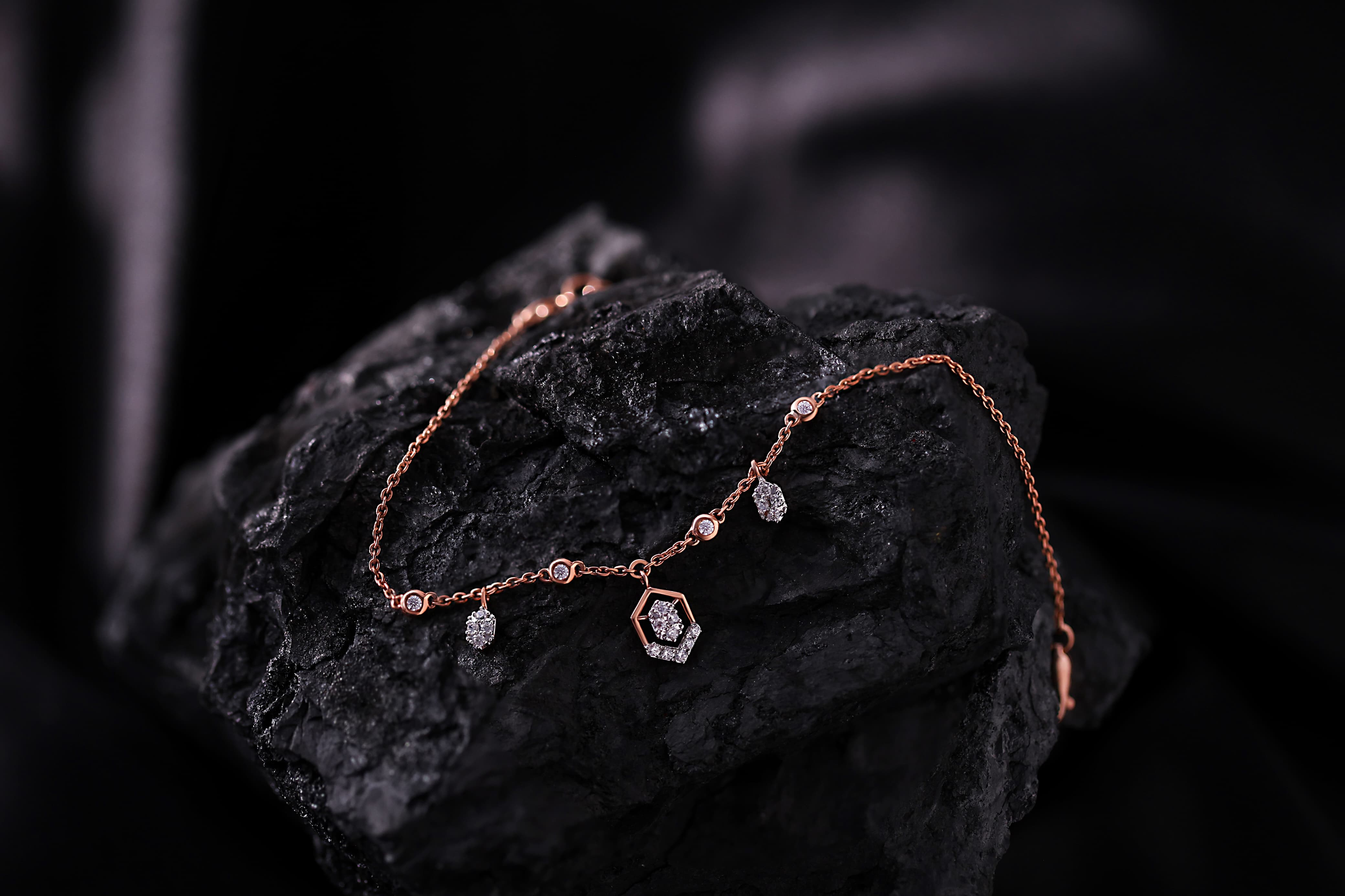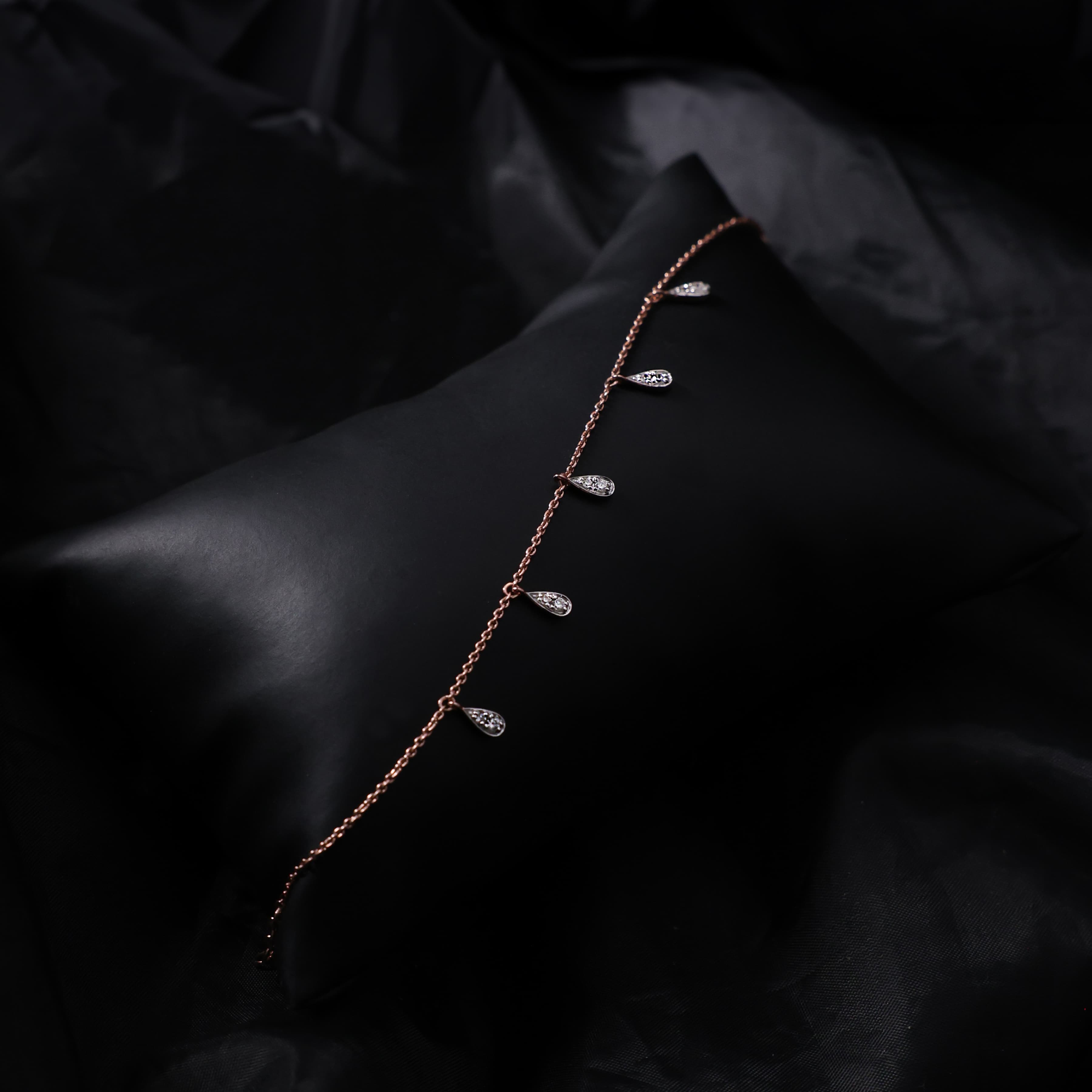 Inspired by the glistening allure of diamonds, the Shimmery Drops Diamond Bracelet has a stylish aesthetic. Crafted in 14K rose gold, this 0.18 carat diamond chain bracelet is designed with intricate water droplet patterns that not only enhance the minimalist design but also add a touch of depth and dimension.