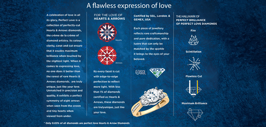 Celebrate your love with Perfect Love hearts & arrows cut diamond certified by renowned gemological laboratories like SGL, London, and GEMEX, USA. These certifications serve as a mark of assurance, guaranteeing that you are acquiring a treasure that will stand the test of time. So, visit your nearest Senco Gold and Diamonds store, and experience the allure of these extraordinary diamonds to embrace your love in their sparkling brilliance. Remember, true love is as rare as a Perfect Love Hearts & Arrows diamond - where rarity meets everlasting love.