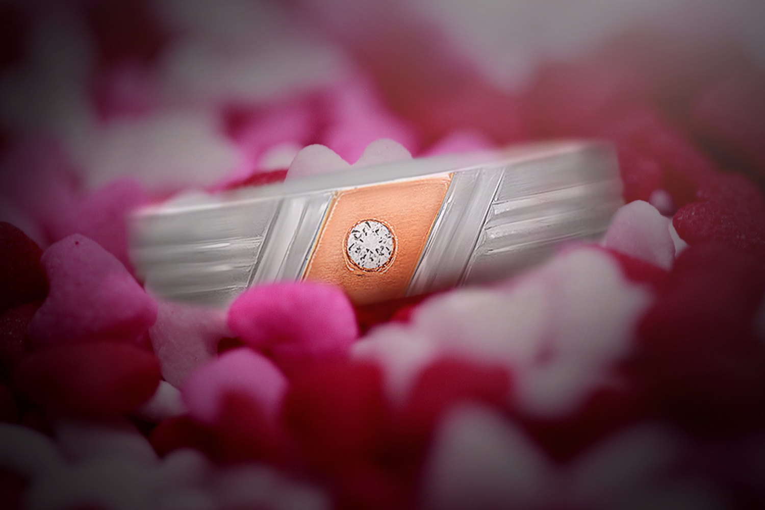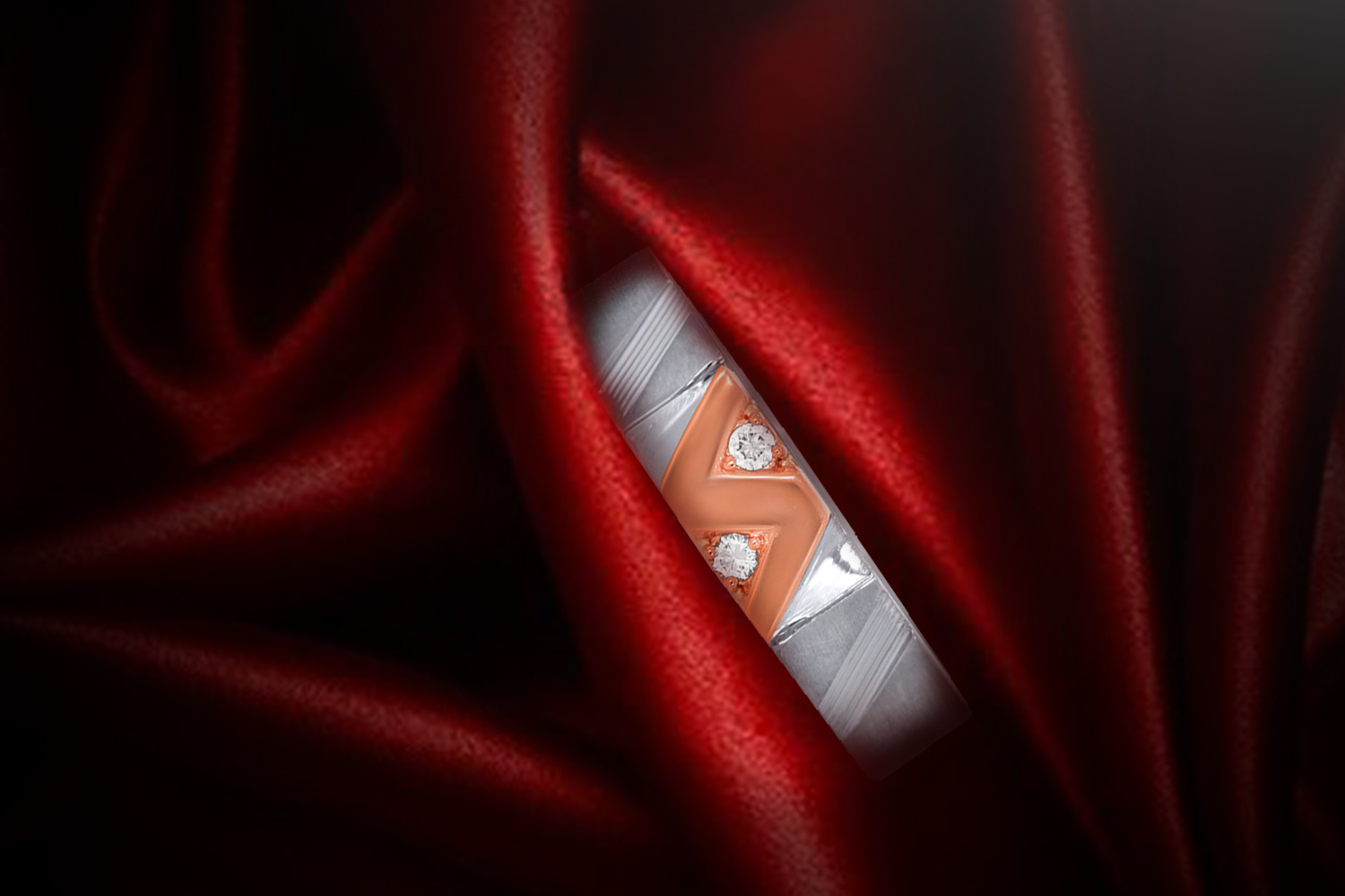 The Secure Duo Shine Platinum Band Ring and Dual Streaks Men Platinum Band Ring are crafted identically with few linear patterns on the sides and two streaks of line in 18K rose gold surrounding two diamonds encrusted in the middle.