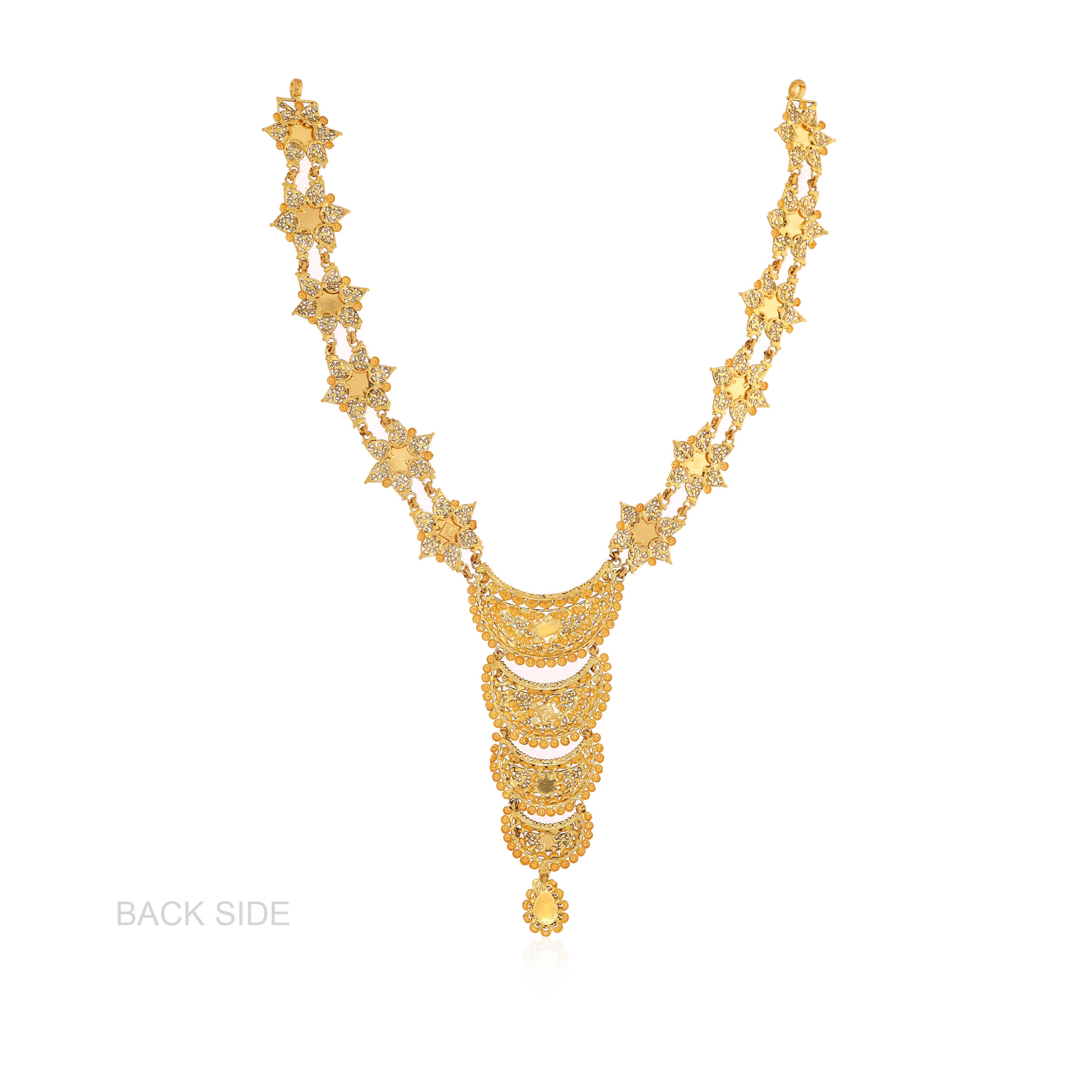 This 22K antique gold necklace celebrates the unyielding spirit of Dhanteras with intricately designed moon motifs. The floral patterns with filigree work and a subtle semi-precious stone will complete your festive look with a promise of everlasting beauty.