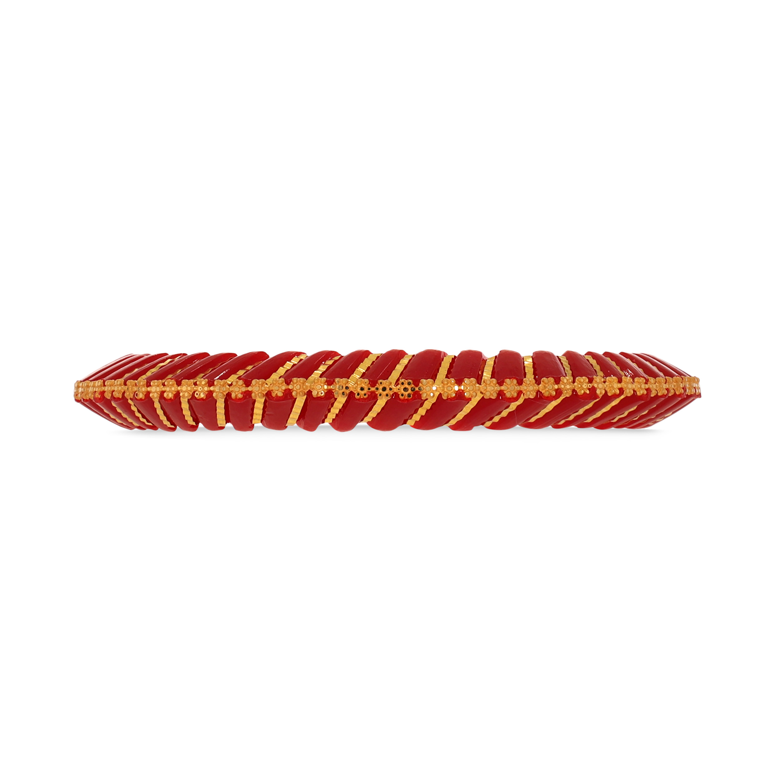 Deeply rooted in marital traditions, this 22K gold pola bangle is a cherished symbol of love and commitment. The radiant red coral, meticulously crafted into a captivating spiral design, symbolises the passionate journey of a married woman, while the gleaming 22K gold accents represent prosperity and auspiciousness.