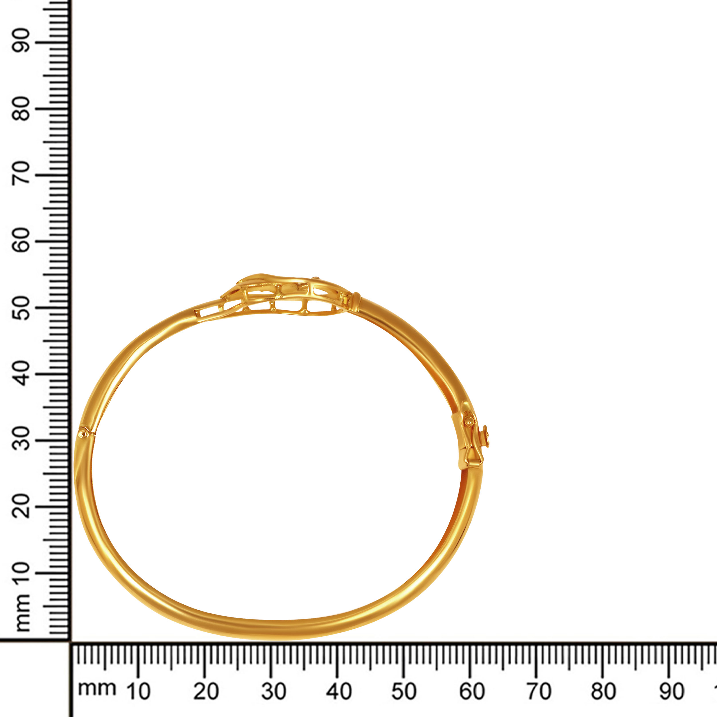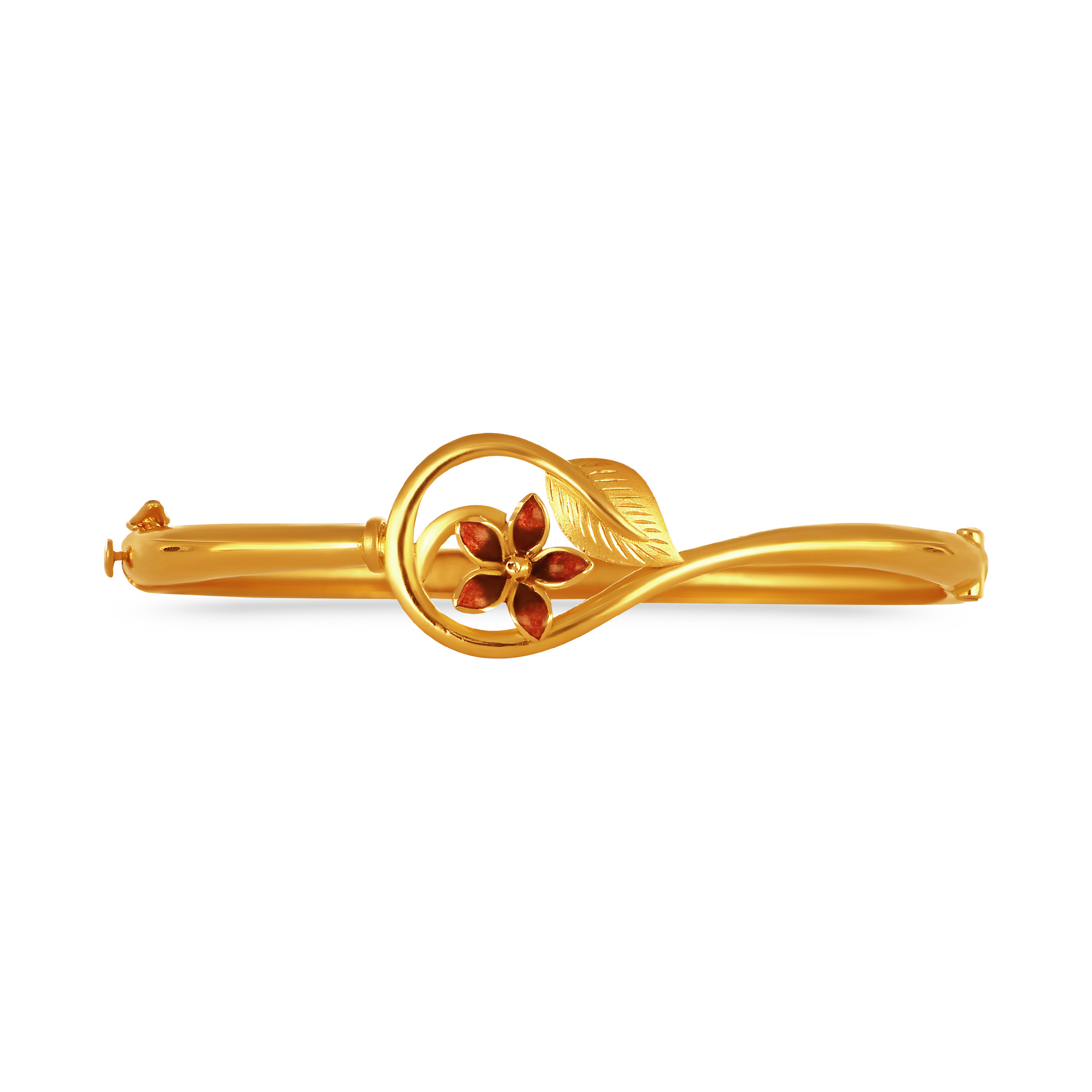 Add a touch of vibrant elegance with this 22K yellow gold chur, featuring a floral motif adorned with intricate red and gold meenakari petals. The polished band ensures a comfortable fit, perfect for special occasions. A beautiful blend of traditional craftsmanship and contemporary design.