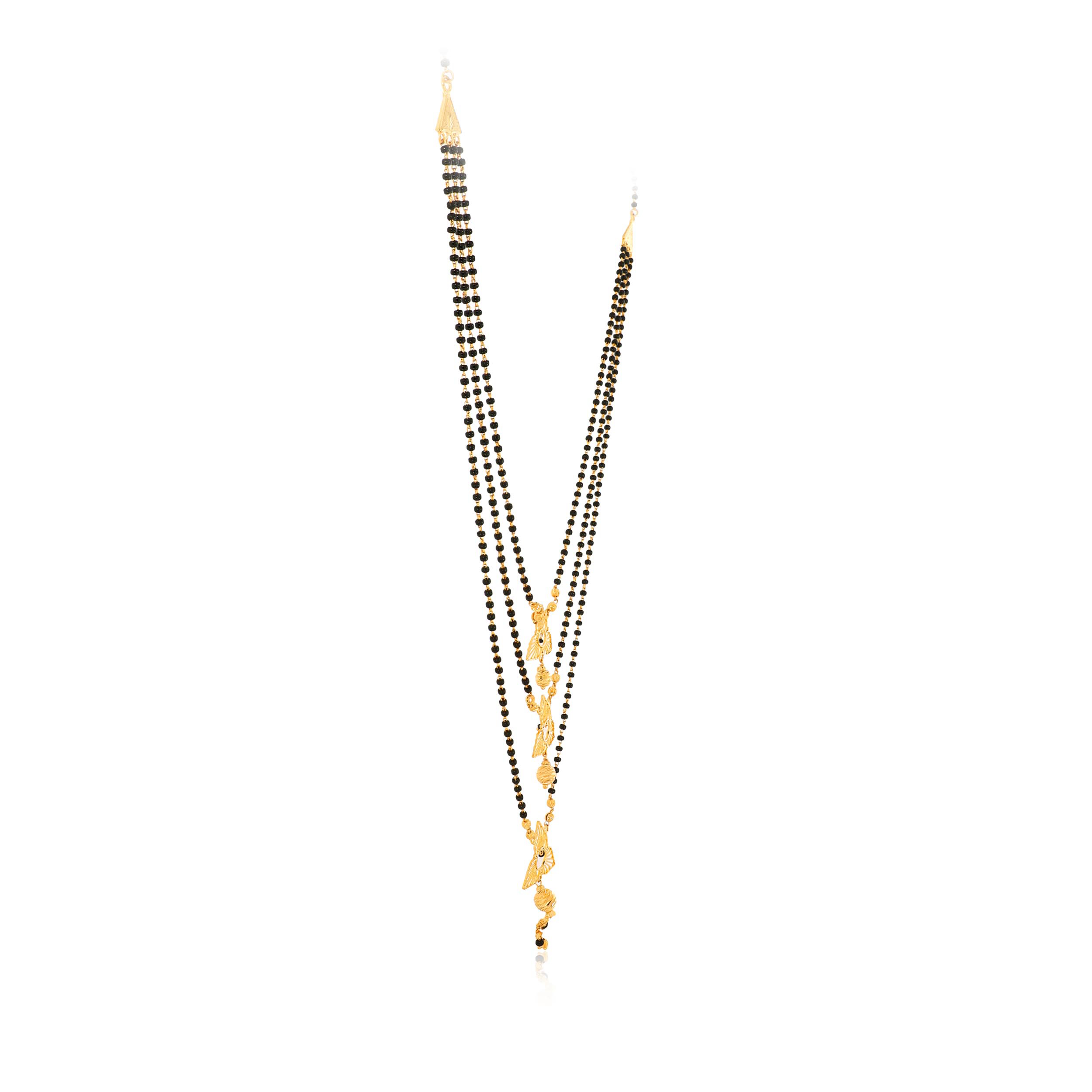 This three layered 22K gold mangalsutra is beautifully designed with three sleek floral motifs inspired by nature. Crafted with precision and designed to perfection, this piece of accessory brings together traditional charm with a modern touch.