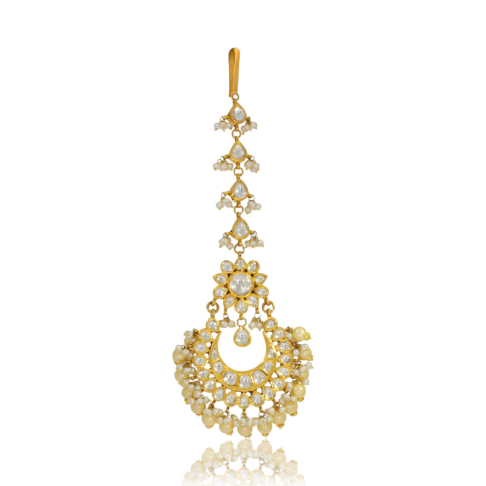 This gold maang tikka is an absolute stunner for the Traditional You. The gorgeous design with white beads and stones will glorify your stunning attire entirely.