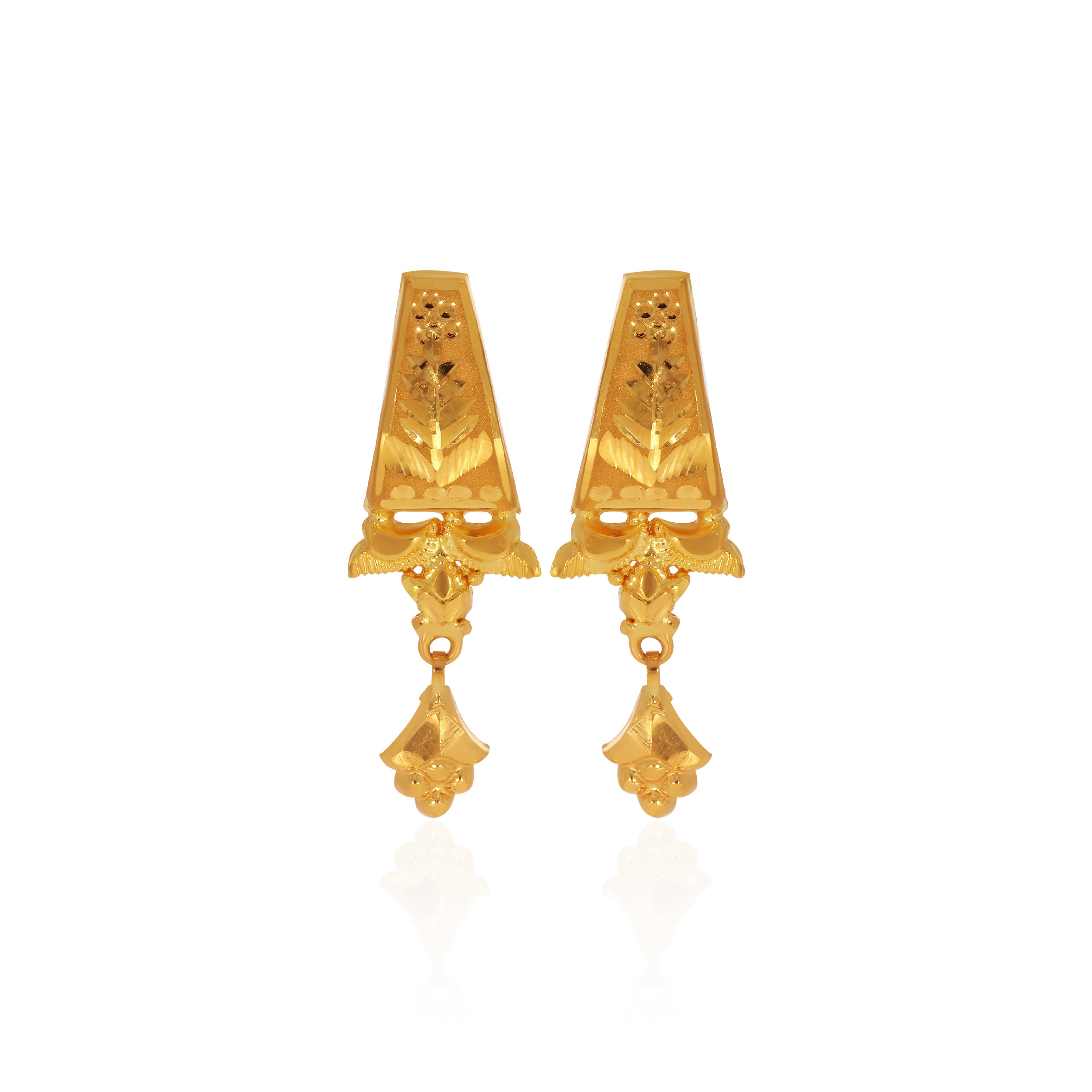 These 22K gold drop earrings are designed in a triangular pattern with leaf motifs. The chillai work in gold frosting background adds to their shine. The pattern dangling at the bottom has a feminine glow.