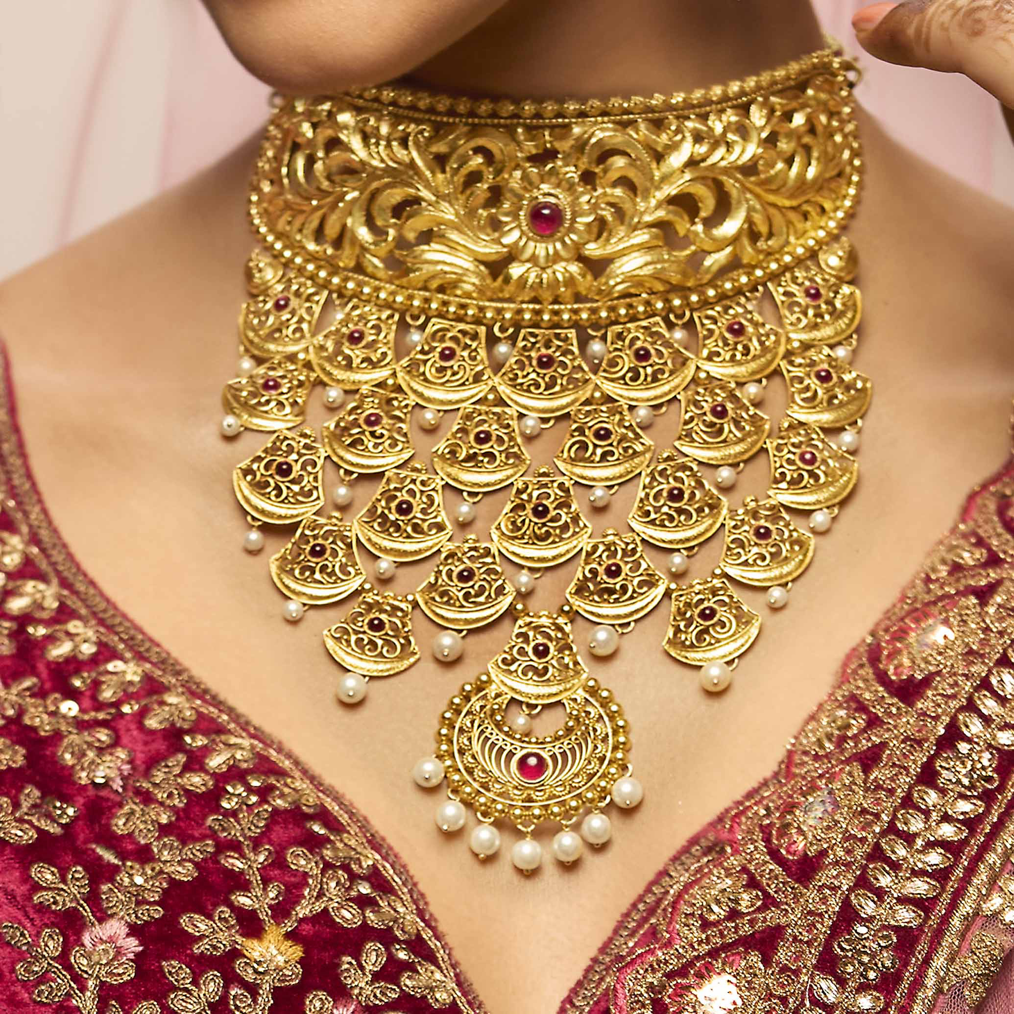 This 22K gold exquisite choker features antique nakashi work and intricate hanging filigree details, finished with vibrant red stones and pearls. A perfect complement to your bridal look, it adds an element of regal elegance and timeless charm to your special day.