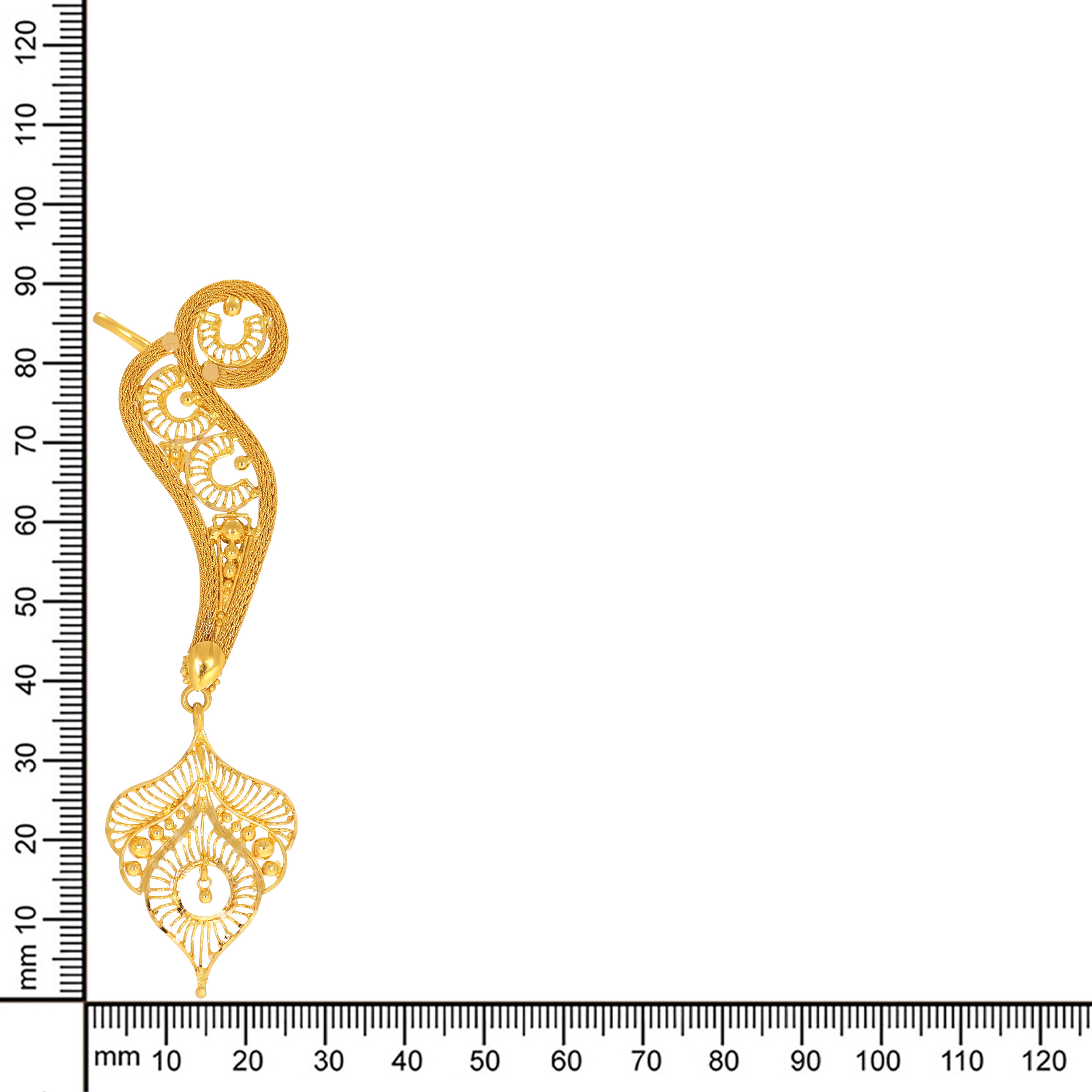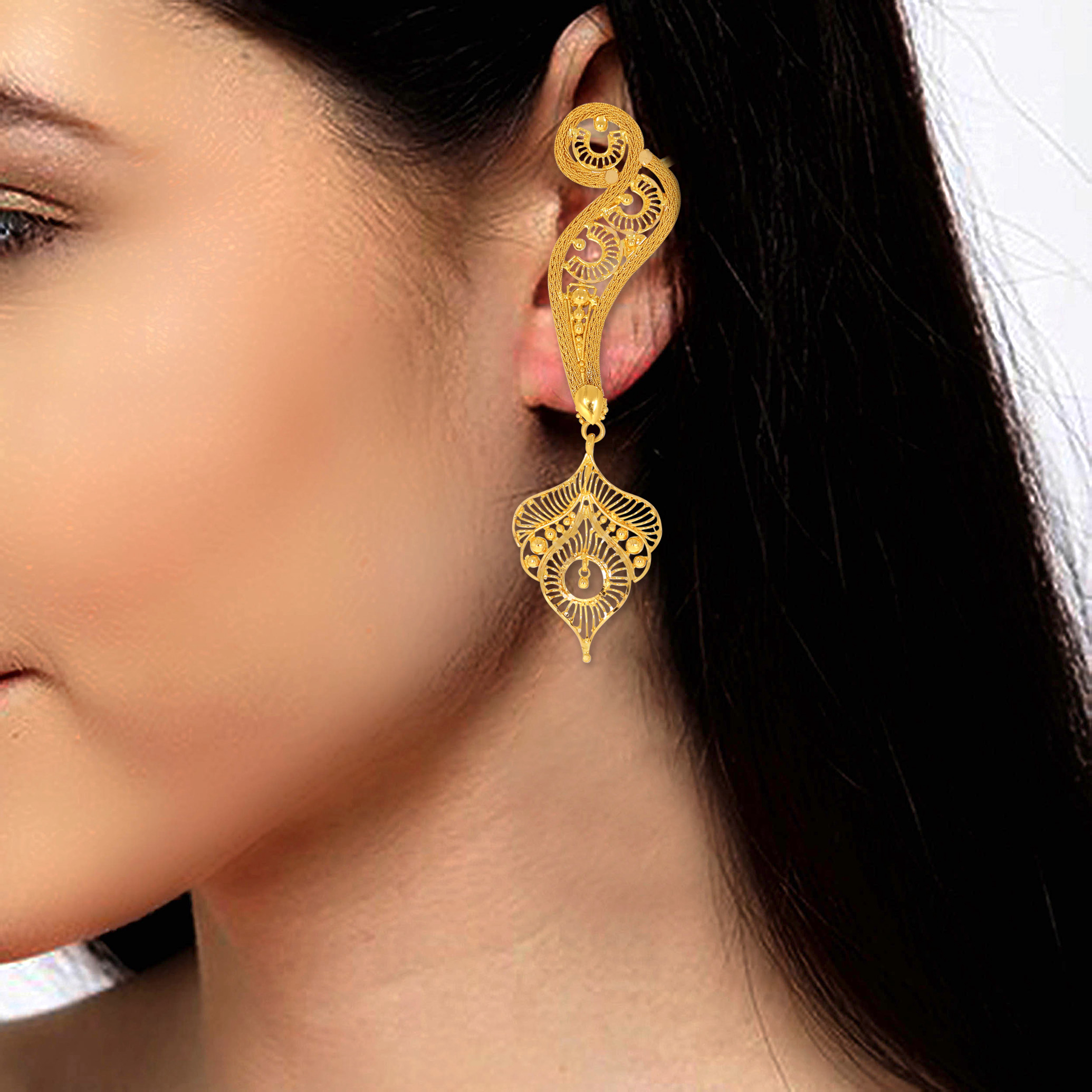 Adorned with an intricate peacock plume motif, these 22K gold earrings will add a touch of royal sophistication to your bridal look. These earrings embody beauty and enchantment with exquisite artisanal craftsmanship.
