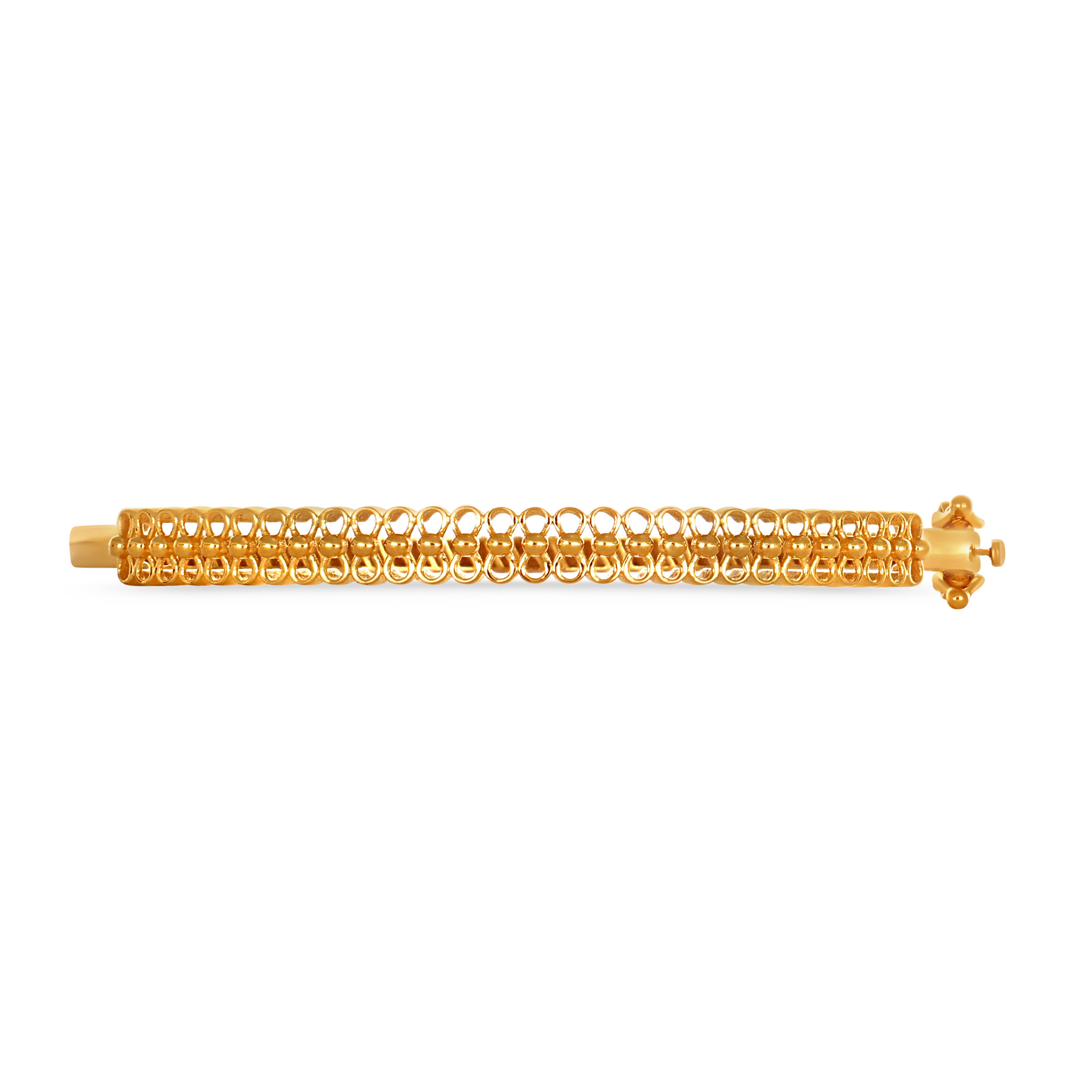 Celebrate your unique style with this 22K yellow gold chur bangle. Its slender, circular form features a captivating lattice design, with a delicate row of individually set, rounded shapes. A unique piece that radiates sophistication, perfect for adding a touch of refined charm to your ensemble.