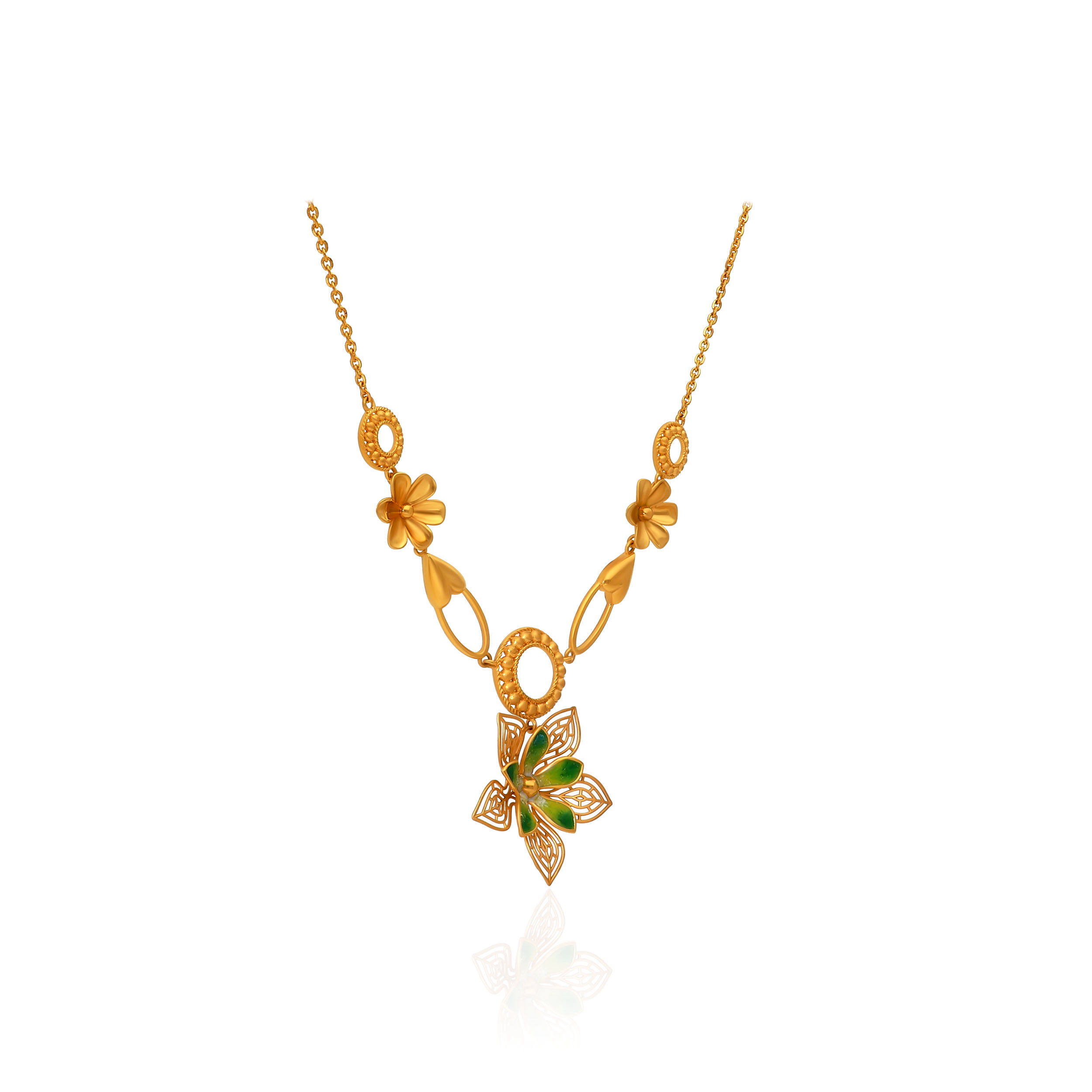 Elevate your eveningwear with this exquisite gold necklace, featuring a graceful floral design accentuated by vibrant green enamel. A striking statement piece for parties, elegant dinners, and any occasion that calls for sophisticated style. Pair it with an emerald-hued saree or a sleek black gown to let the colours truly shine.