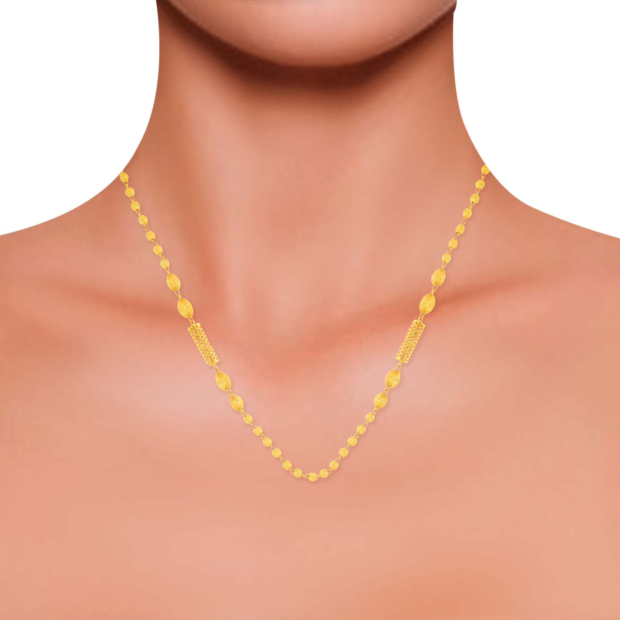 This 22K gold chain is designed with an array of gold rajkot balls. The versatile patterns make this piece of jewellery simple, yet stunning. The perforated elongated pattern adds a unique touch to the chain.