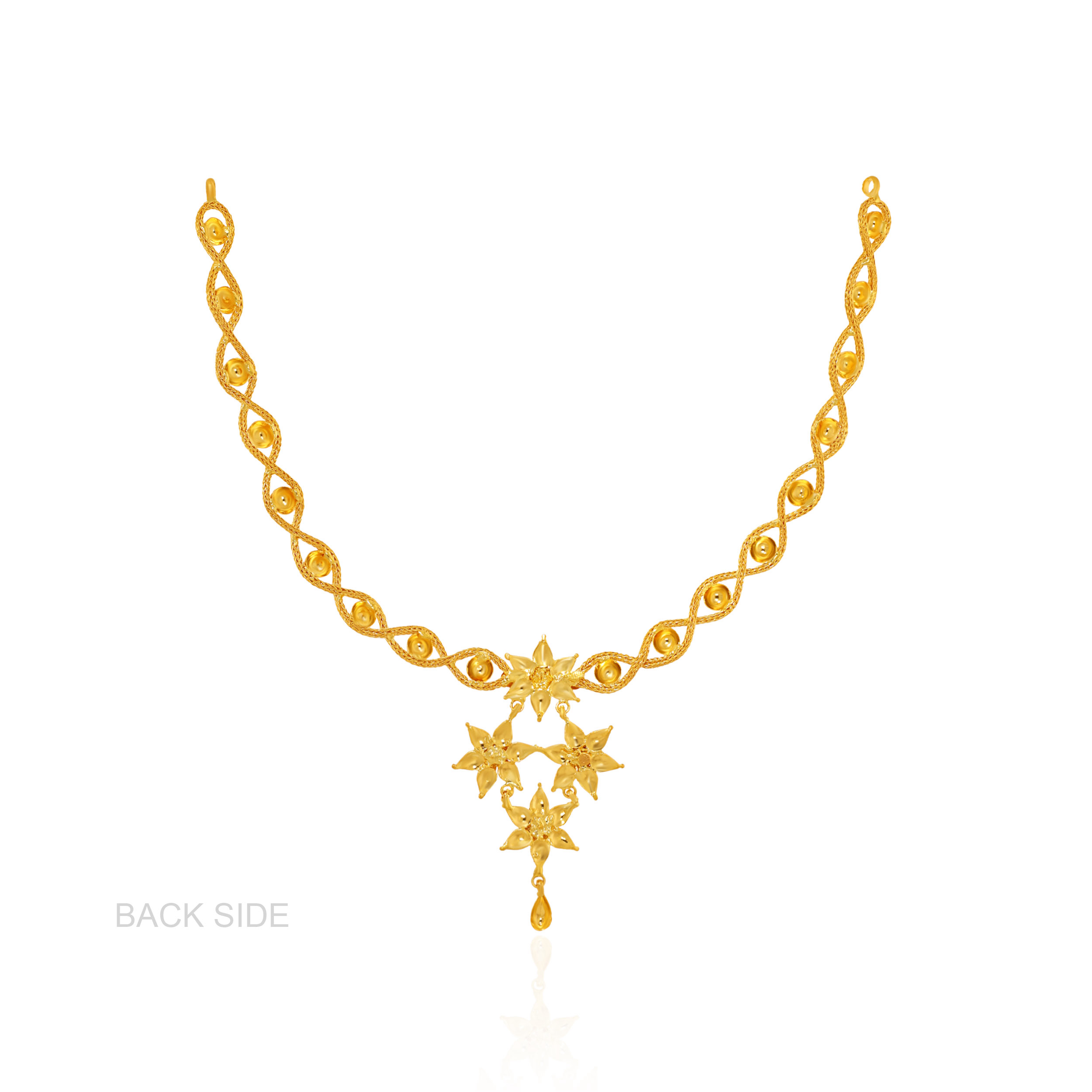Inspired by the grace of blooming petals, this 22K yellow gold necklace showcases a trio of star-shaped floral elements, delicately suspended from an intricately looped chain. With fine texturing and a fluid silhouette, it's a charming pick for special celebrations and traditional gatherings alike.