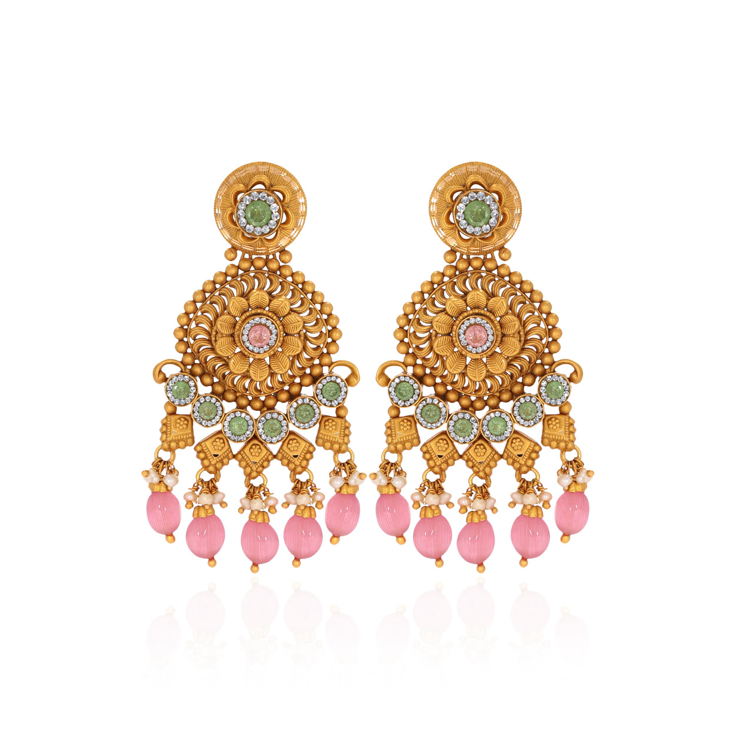 Crafted in 22K yellow gold, these antique-designed earrings showcase a meticulous stone setting that enhances their timeless appeal. A perfect blend of heritage and sophistication, they add a touch of elegance to any occasion.
