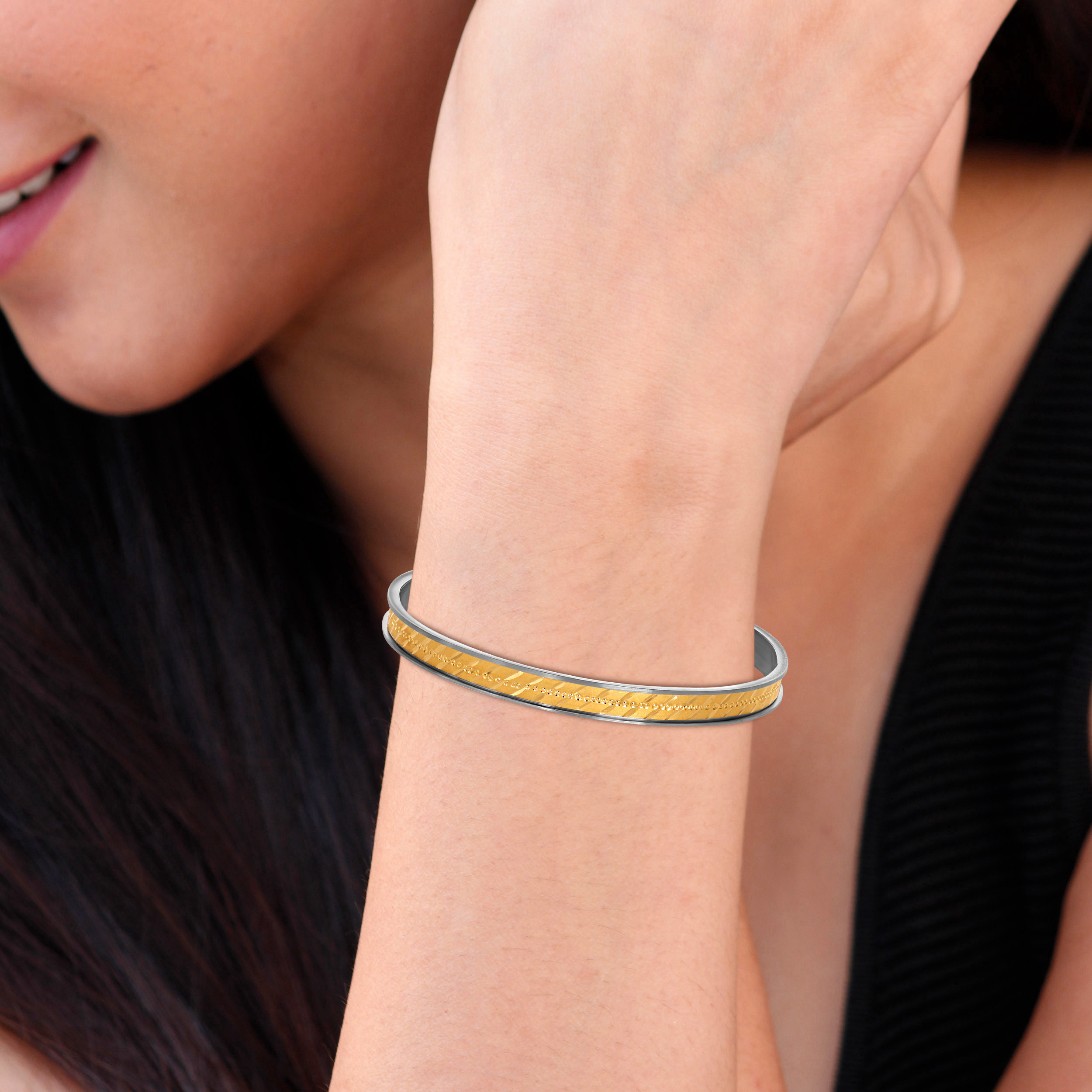 This 22K yellow gold Noa bangle features a sleek channel design with intricate diagonal patterns and fine detailing. The contrasting metal finish adds a refined touch to its timeless appeal.