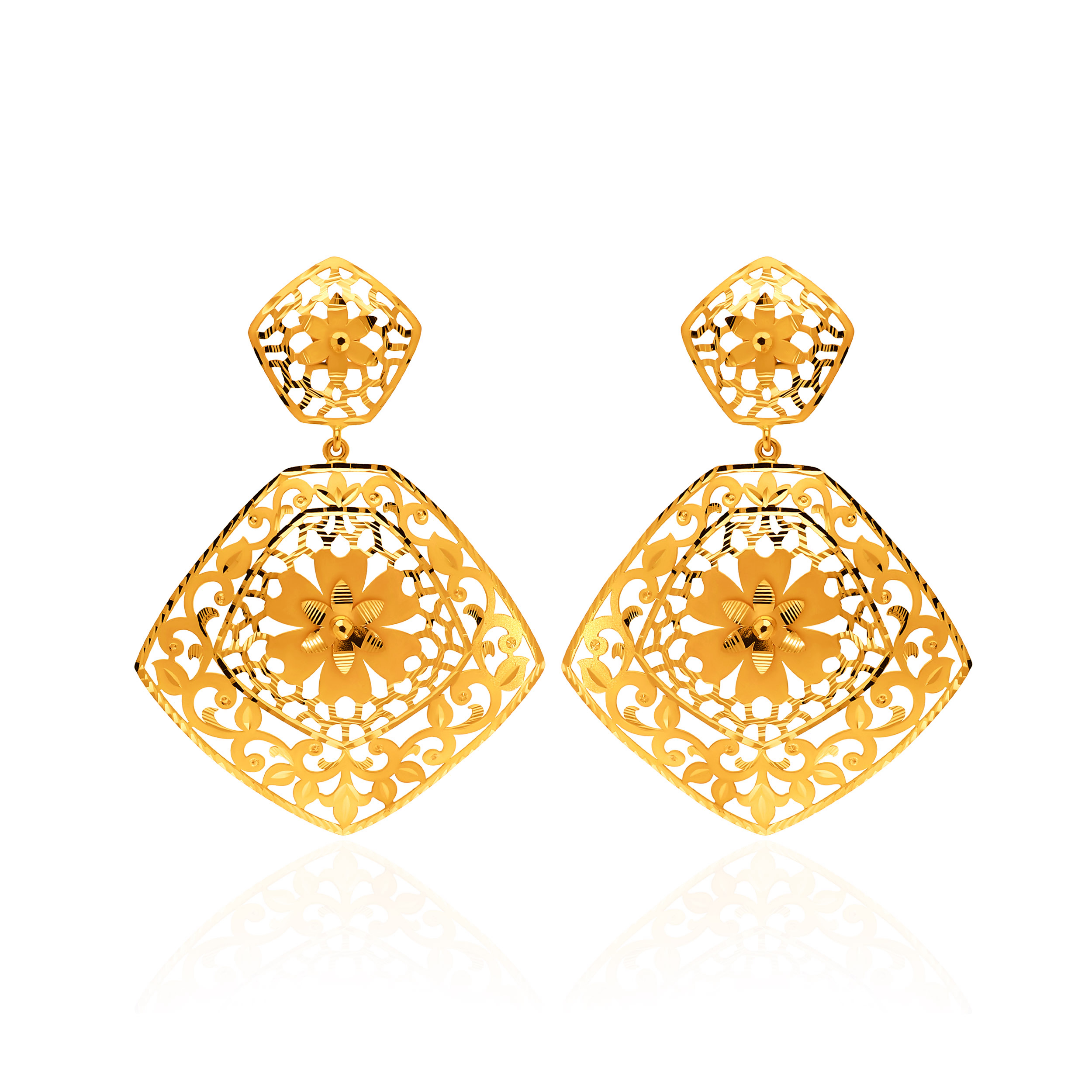 Embrace modern sophistication with these striking 22k gold drop earrings. The laser-cut geometric shapes are beautifully integrated with floral motifs, creating a unique and contemporary design. These earrings offer a bold yet elegant statement. These earrings offer the ideal balance of modern flair and elegance, making them perfect for formal dinner parties or upscale events. PLEASE NOTE:- The dimensions oThe dimension of the actual product might vary.