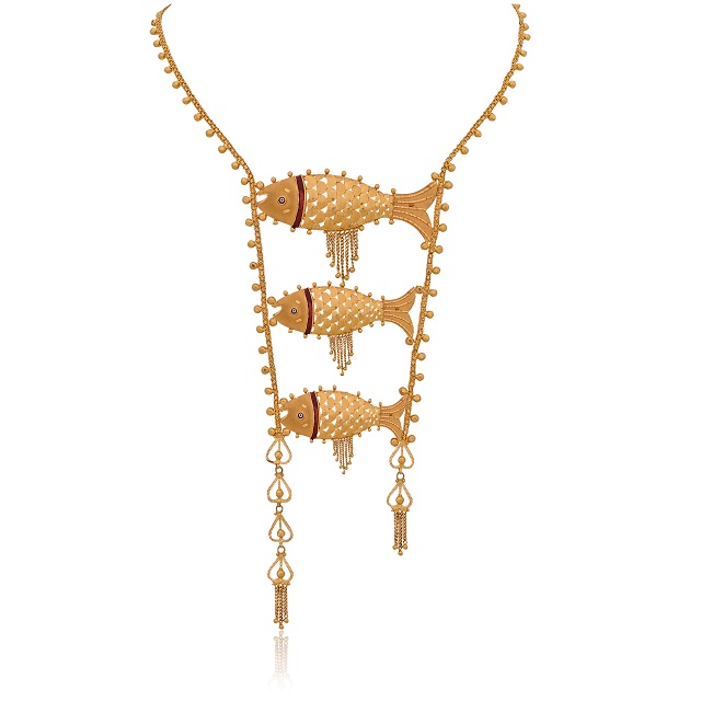 The asymmetrical pattern of this gold necklace always has its own trend. Fish galvanized decorated ornament has trendsetting innovation, which personifies the entire design. Be the lucky one by pairing this bouquet of charm with your attire.