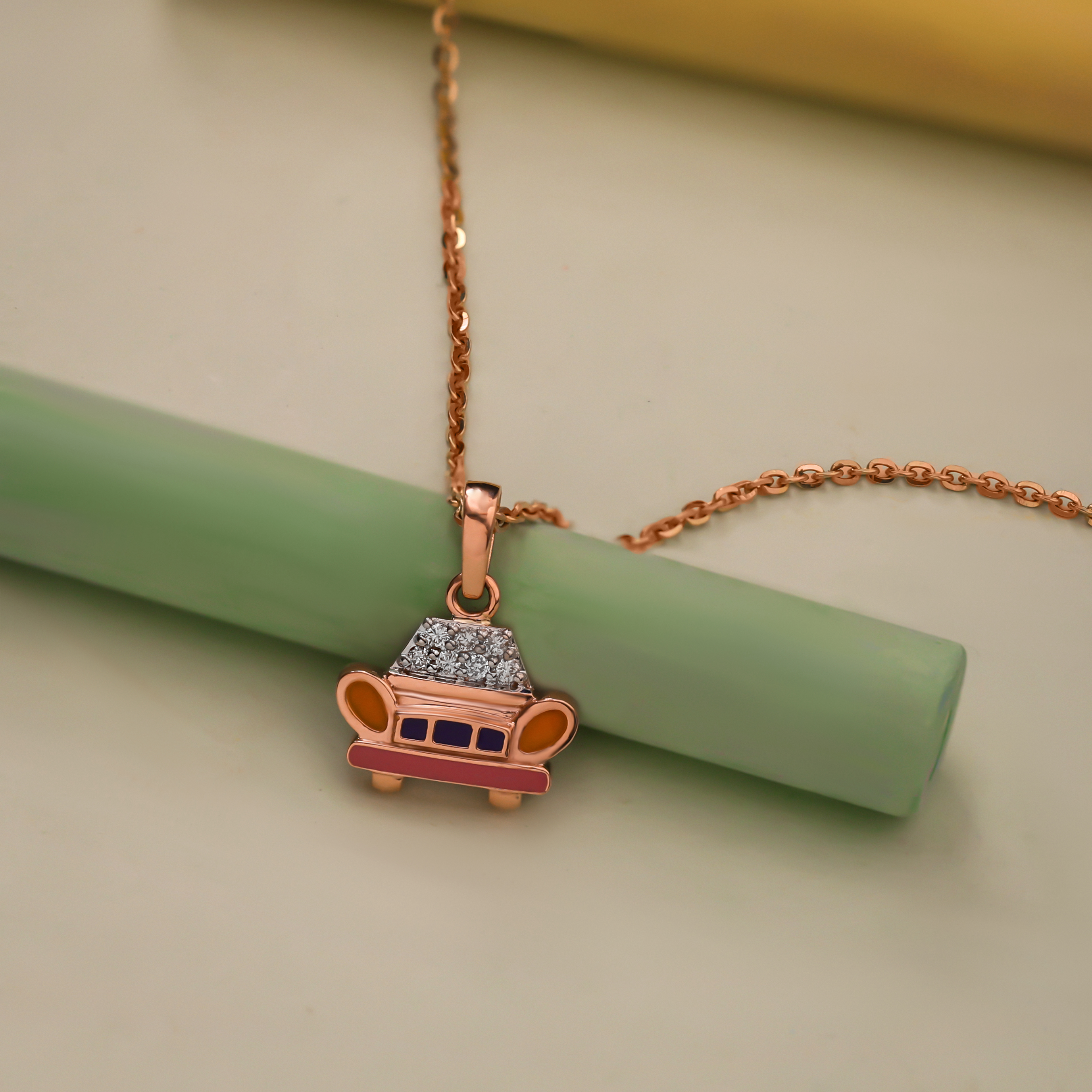 Celebrate your child's passion for cars with this 0.08 carat kids diamond pendant crafted in 14K rose gold. The unique design has vibrant meenakari work that is sure to captivate young minds.