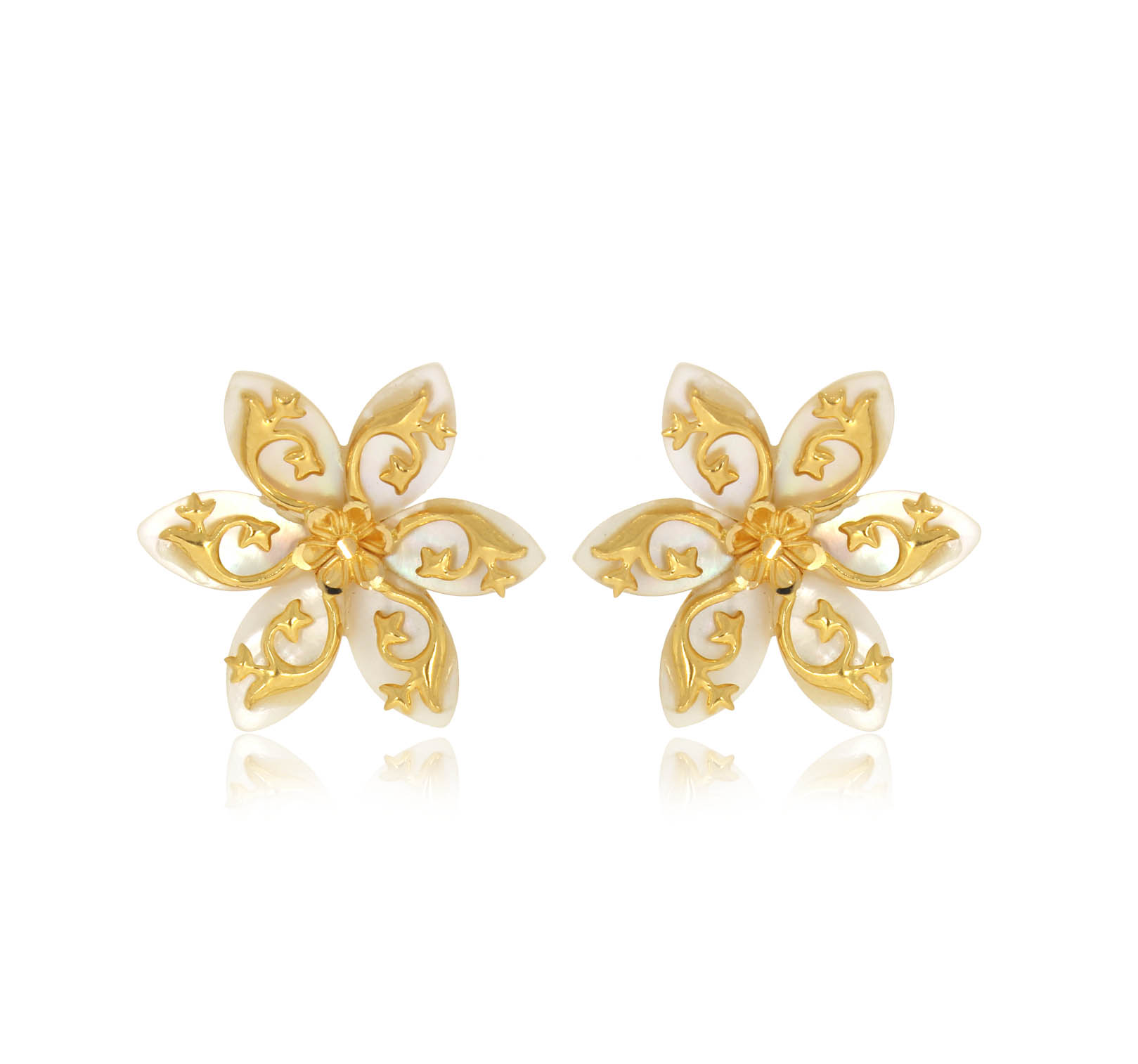 Shell is the home of elegance that shower with chinese pearls. These white shell flower casting gold studs that shower you with elegance and shine. Adorn these beautiful earrings with your daily wear to formal wear. Best place to wear office, casual outings, and daily lives.