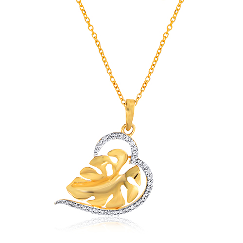 The leaves of the Monstera plant develop perforation at maturity and have inspired the design of this fashionable diamond pendant. Numerous diamonds are encrusted in a partial heart motif. The artistic leaf motif in gold will add to your charm and enhance the confidence of todays women.