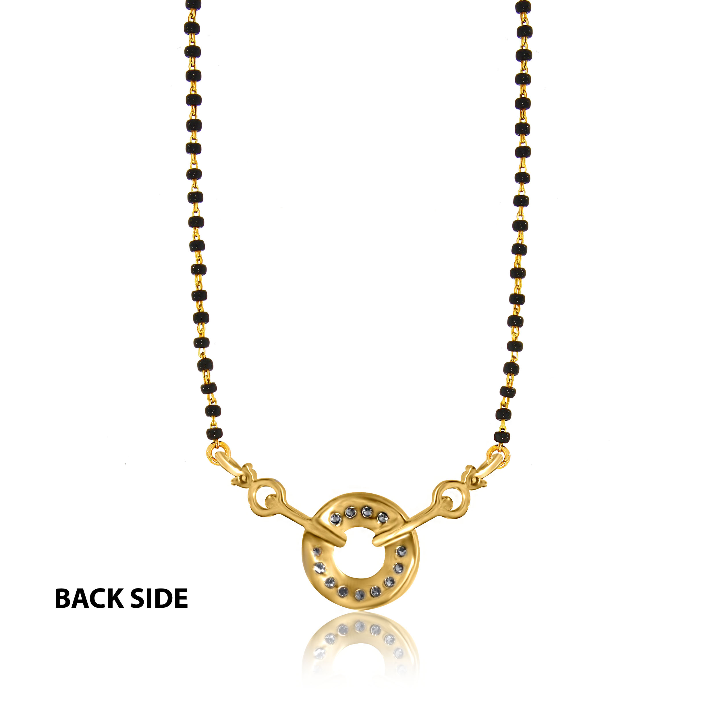 Unleash the beauty of creative karigari and craft by choosing this piece of jewellery. This glamorous diamond mangalsutra is designed with shiny 0.18 carat diamonds studded in a circular design that holds the wheel motif on both sides. Adorn this pendant in 14K gold for an evening party and look stunning as ever. Please Note:- This product comes without the chain